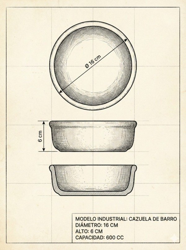 Diámetro 16 cm, alto 6 cm, capacidad 600 cc